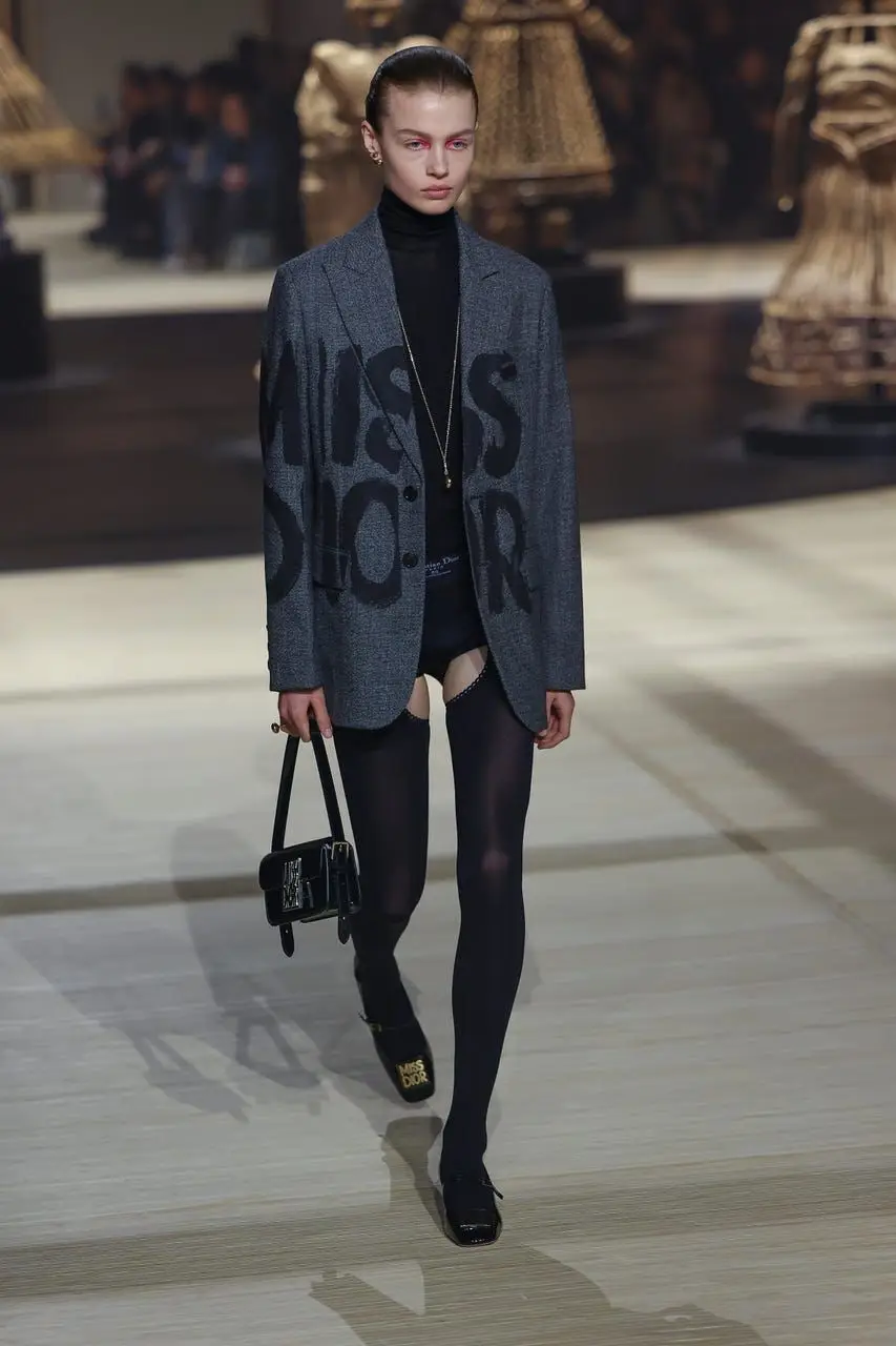 From the moment you put it on, the difference is palpable. The suit jacket features a dramatic peak lapel, elegantly faced with rich satin that catches the light with a subtle glow. The silhouette is impeccably sculpted—narrow at the waist with a clean chest and softly padded shoulders for that powerful, yet refined, Dior posture. Attention to detail is paramount, showcased in the functional buttonholes, the elegant barchetta breast pocket, and the precise pick-stitching that traces the lapel.