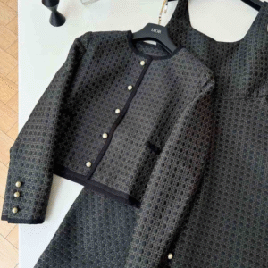 Embody timeless Parisian elegance with the Dior Tweed Short Blazer & Skirt Set. This exquisite ensemble is a masterclass in haute couture craftsmanship, reimagined for the modern wardrobe. Meticulously constructed from the brand’s signature bouclé tweed, the fabric is an intricate tapestry of textured threads, delicate nubs, and subtle metallic filaments that catch the light with every movement.