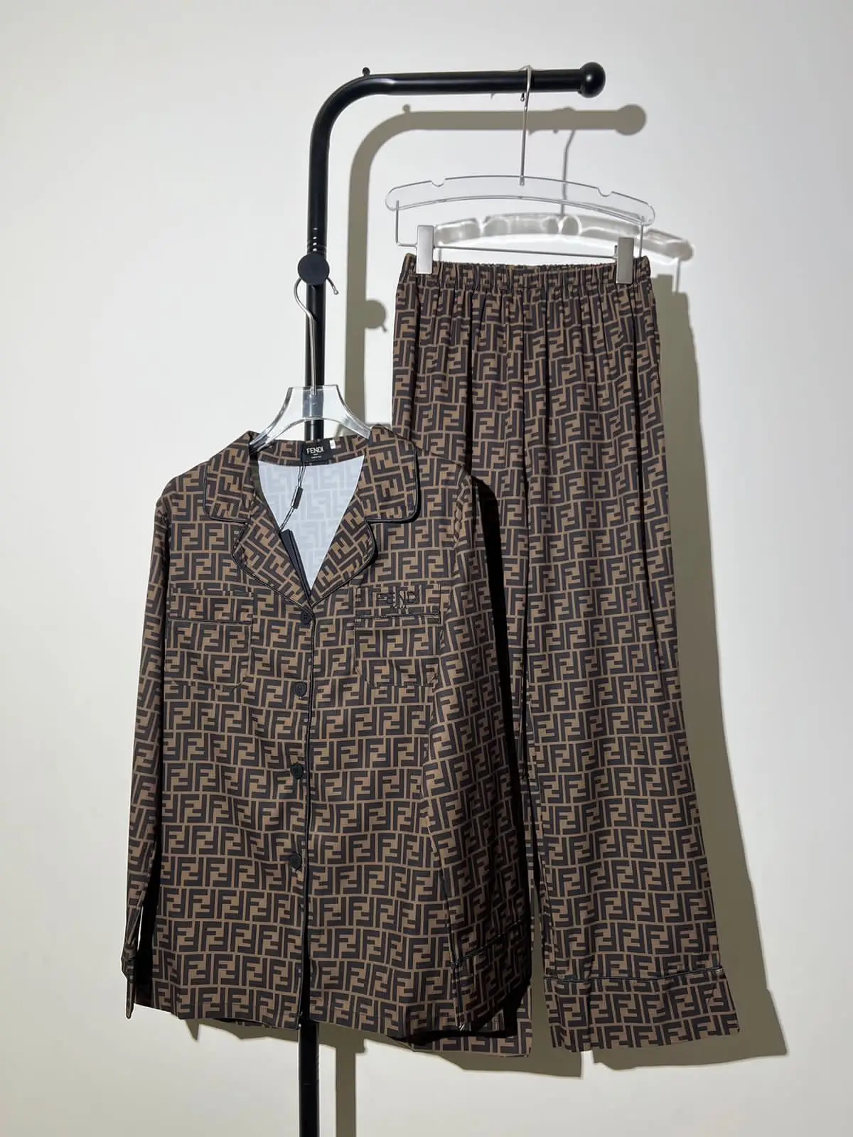 The set features a relaxed-fit shirt and classic drawstring trousers, both rendered in the finest grade silk satin. The fabric glides against the skin with an impossibly smooth hand-feel, offering unparalleled comfort and breathability for a night of sublime rest. Adorned with an exclusive, all-over FENDI print, the design is a subtle yet powerful statement of modern elegance.