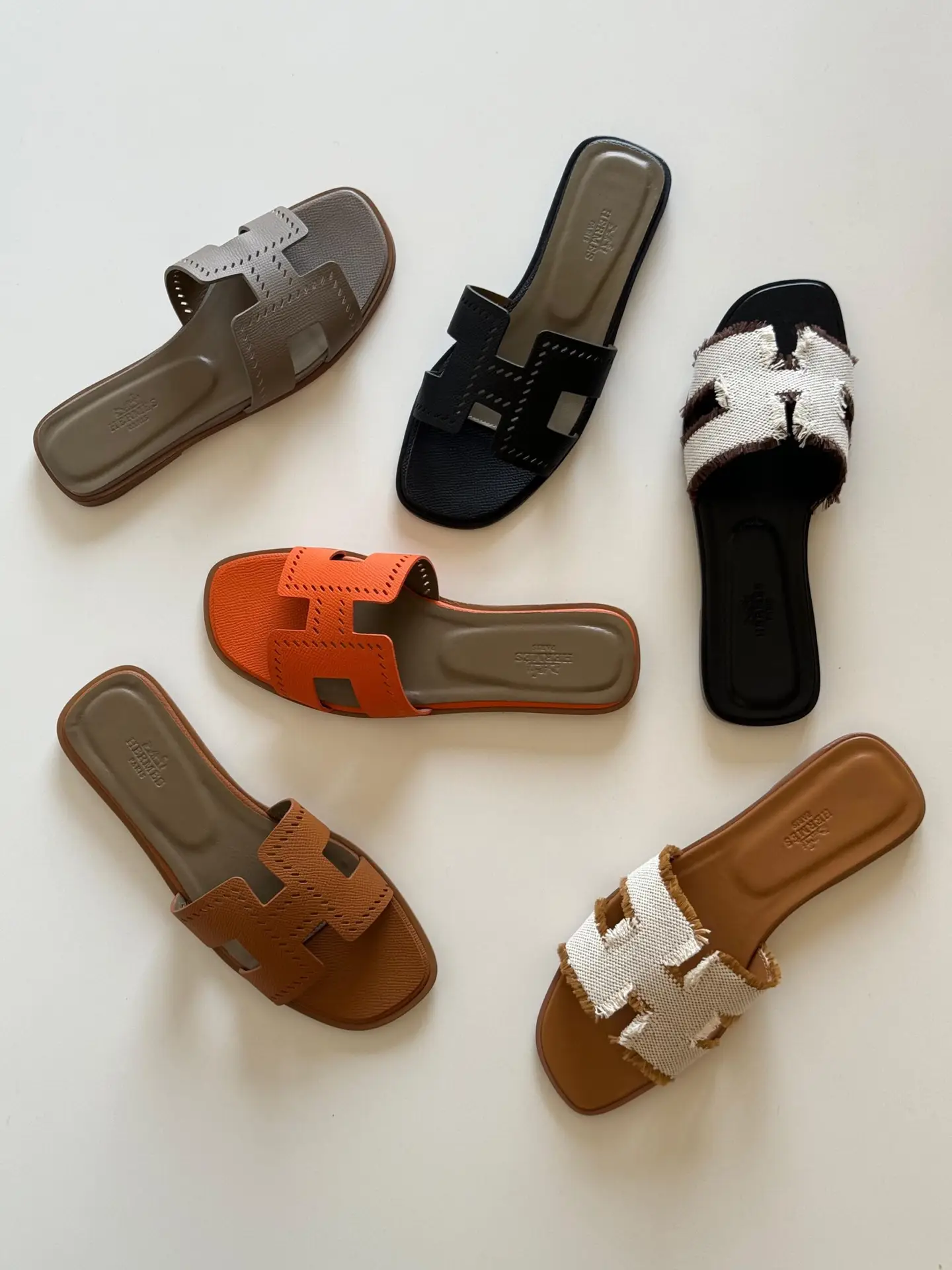 The iconic HERMES Oran Sandal, handcrafted in France from supple calfskin. Featuring the signature H-cutout and a cushioned insole, it offers unparalleled comfort and timeless Parisian elegance.