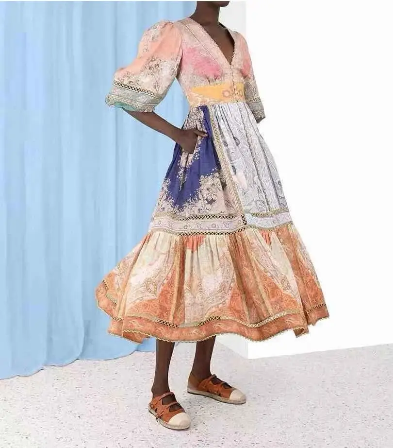 Embody the essence of romantic sophistication with thZIMMERMANN Lantern Midi Dress, a piece that exemplifies the brand’s commitment to super master quality and exquisite design. Crafted from the finest ivory silk georgette, the dress features the iconic lantern sleeve—a dramatic yet graceful statement that billows softly from the shoulder before tapering at the cuff. The delicate floral lace appliqué, meticulously hand-placed, cascades from the bodice, adding a layer of intricate texture and timeless femininity.